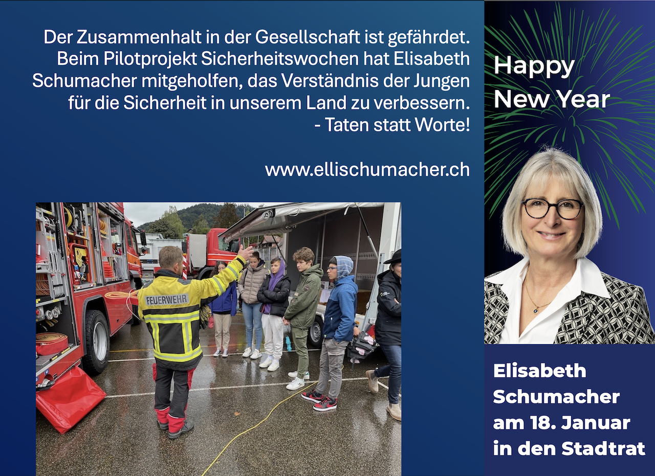 Als Associate Partnerin einer Unternehmensberatung hat Elisabeth Schumacher 2021-2024 mitgeholfen, das Pilotprojekt Sicherheitswochen zu entwickeln und an vier Kantonsschulen zu testen. – Ein nachhaltiger Beitrag zur Sicherheit unseres Landes und für den Zusammenhalt in der Bevölkerung.